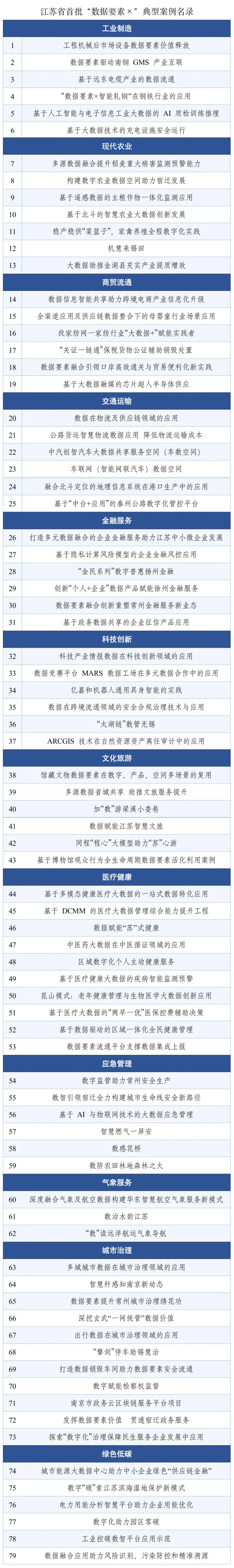 交汇点讯 江苏省数据局日前面向社会公布了2024年省域“数据要素×”首批典型案例名录,涉及12个行业领域共计79个典型案例。