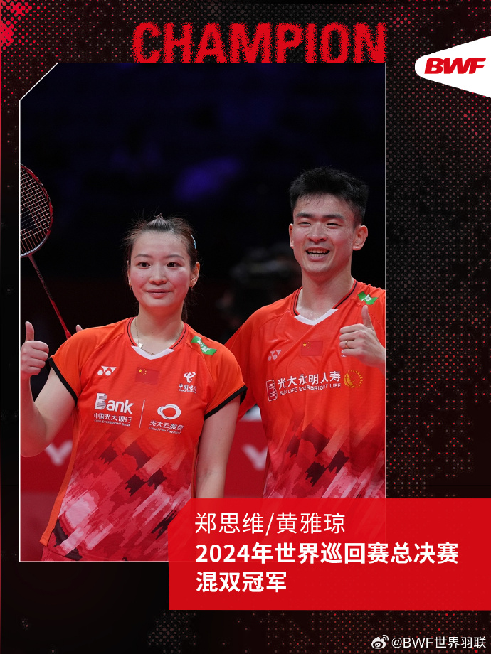 12月15日,2024年世界羽联年终总决赛迎来决赛日。在混合双打决赛中,中国组合郑思维/黄雅琼以2∶1的比分战胜马来西亚组合陈堂杰/杜依蔚,夺得冠军,实现总决赛“三连冠”。祝贺!