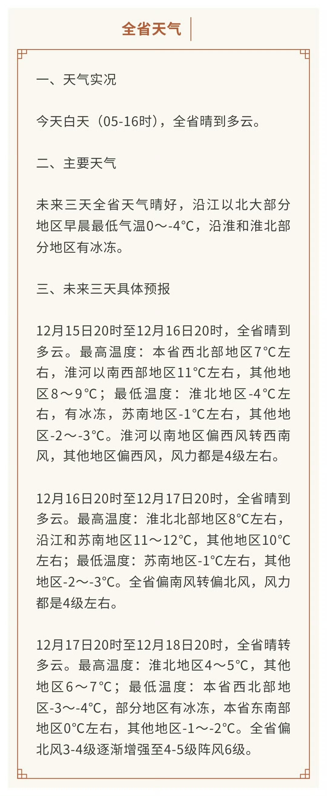 12月15日20时至12月16日20时,全省晴到多云。最高温度:本省西北部地区7℃左右,淮河以南西部地区11℃左右,其他地区8~9℃;最低温度:淮北地区-4℃左右,有冰冻,苏南地区-1℃左右,其他地区-2~-3℃。淮河以南地区偏西风转西南风,其他地区偏西风,风力都是4级左右。