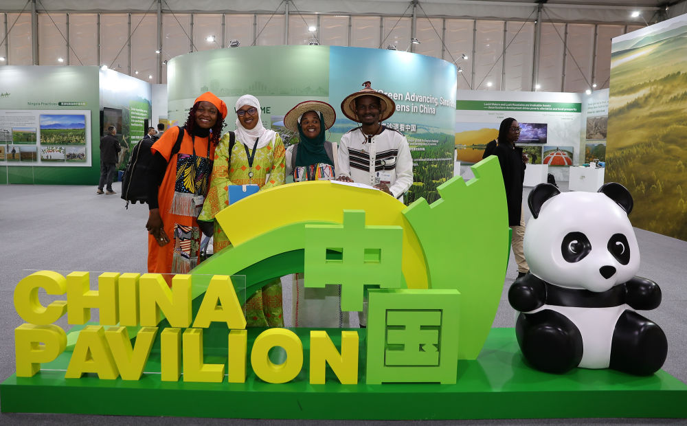 12月4日,参会者在沙特阿拉伯利雅得举行的《联合国防治荒漠化公约》第十六次缔约方大会(COP16)上参观中国馆。新华社记者王东震摄