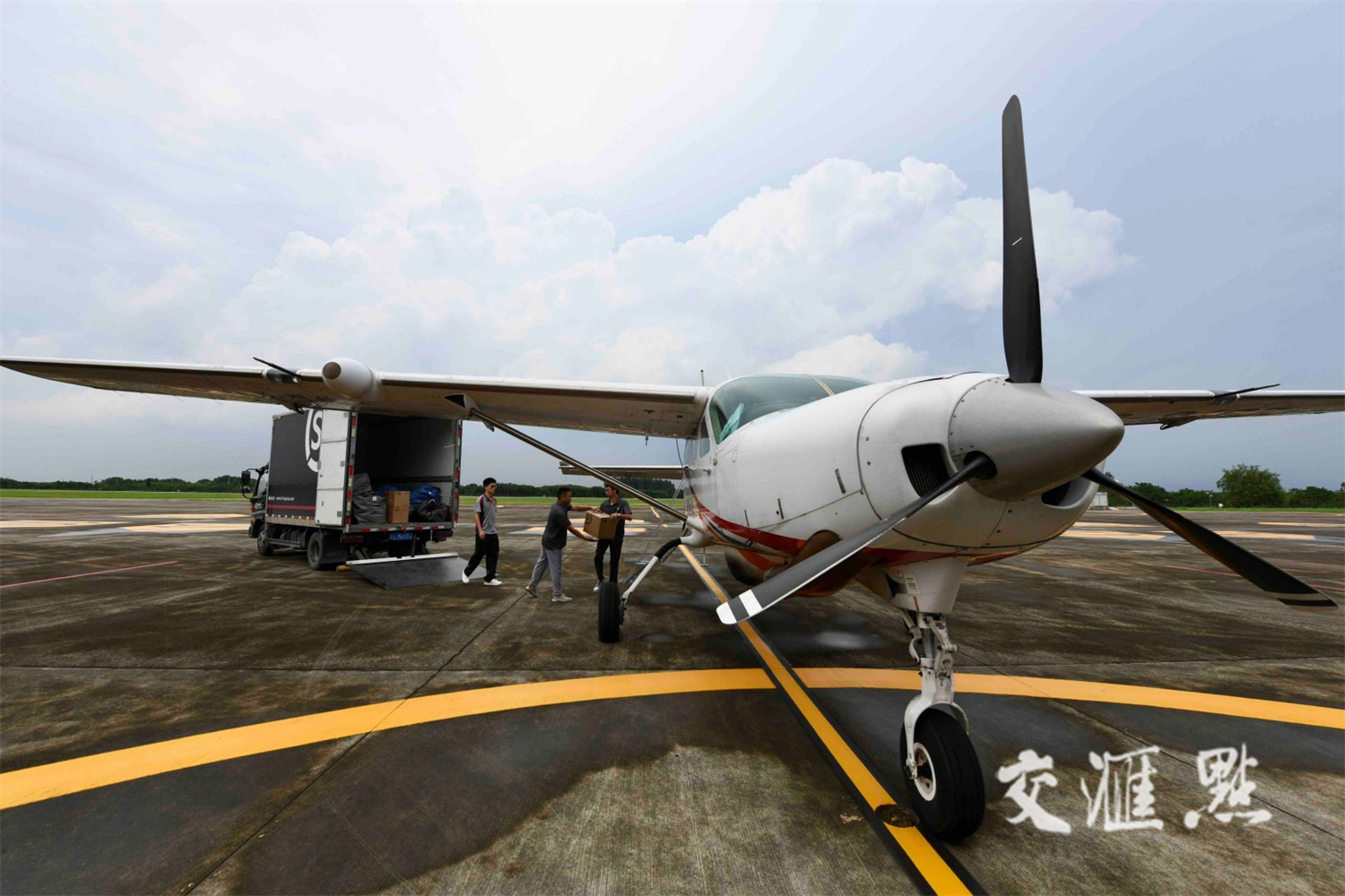 7月18日,在镇江大路通用机场,镇江至合肥低空物流航线成功首飞,在跨省两地间架起了一座空中桥梁,将有力提升两地农产品的附加值,助力农民增收。马镇丹 摄