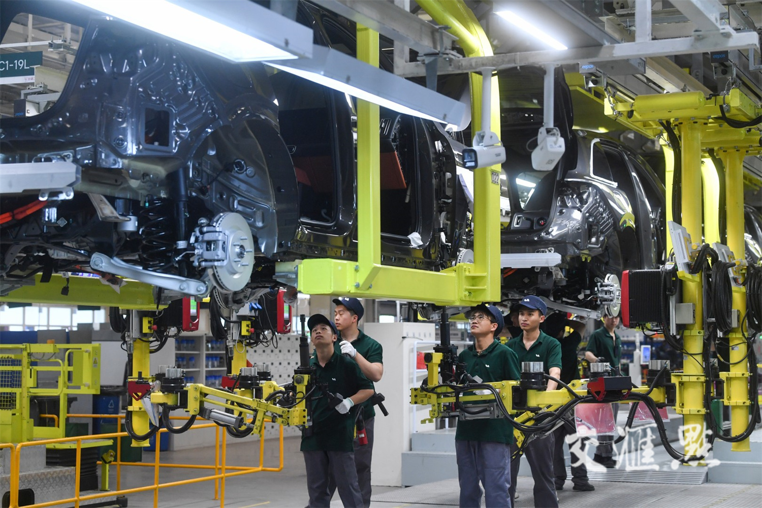 为了展示新质生产力激发出的澎湃发展动能,我选择了南京新能源汽车生产基地进行拍摄。由于企业生产车间光线偏暗,我根据现场机械臂运动的快慢程度,把相机设置连续拍摄,模式分别为:快门速度1/13s、光圈值F5.6、感光度ISO800、曝光补偿+1.0、白平衡自动、光圈优先、加权测光,构图时借助企业2米高的人字梯居高临下,拍摄时端稳相机屏住气,防止因抖动造成对焦不清晰。