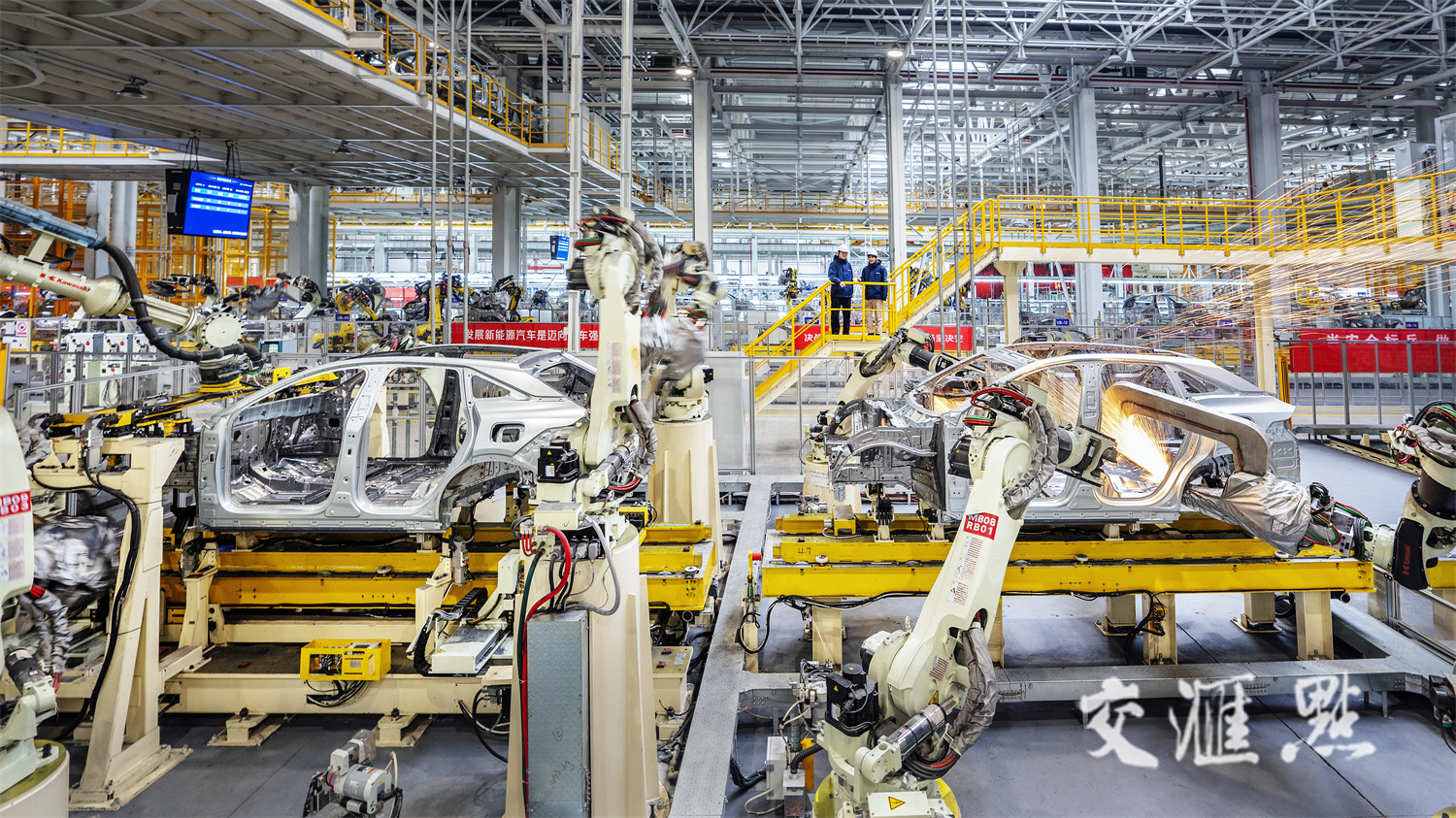 2月2日,位于南京市溧水区的南京长安新能源汽车生产基地,一线员工和自动化产线机械臂正在焊接组装长安深蓝S7新能源品牌车。朱红生 摄