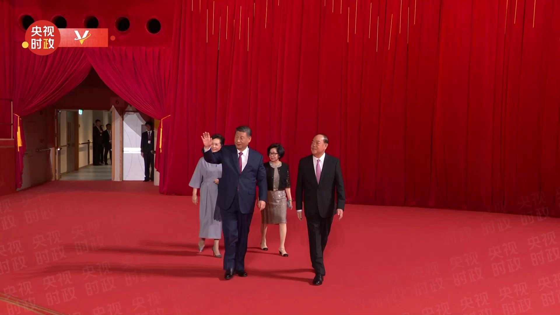 演出现场灯光璀璨,欢乐喜庆。20时许,欢快的乐曲声响起,习近平和夫人彭丽媛在澳门特别行政区行政长官贺一诚和夫人郑素贞陪同下,步入晚会现场。全场观众起立鼓掌,热烈欢迎。