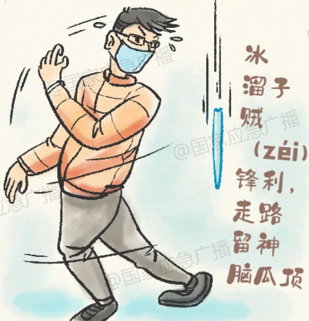 积雪白天融化,夜晚结冰,易使屋檐、外墙出现冰溜子,走路时请远离挂着冰溜子的建筑物。