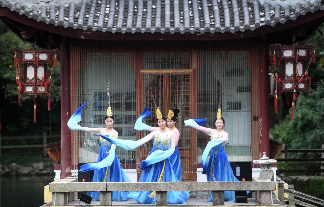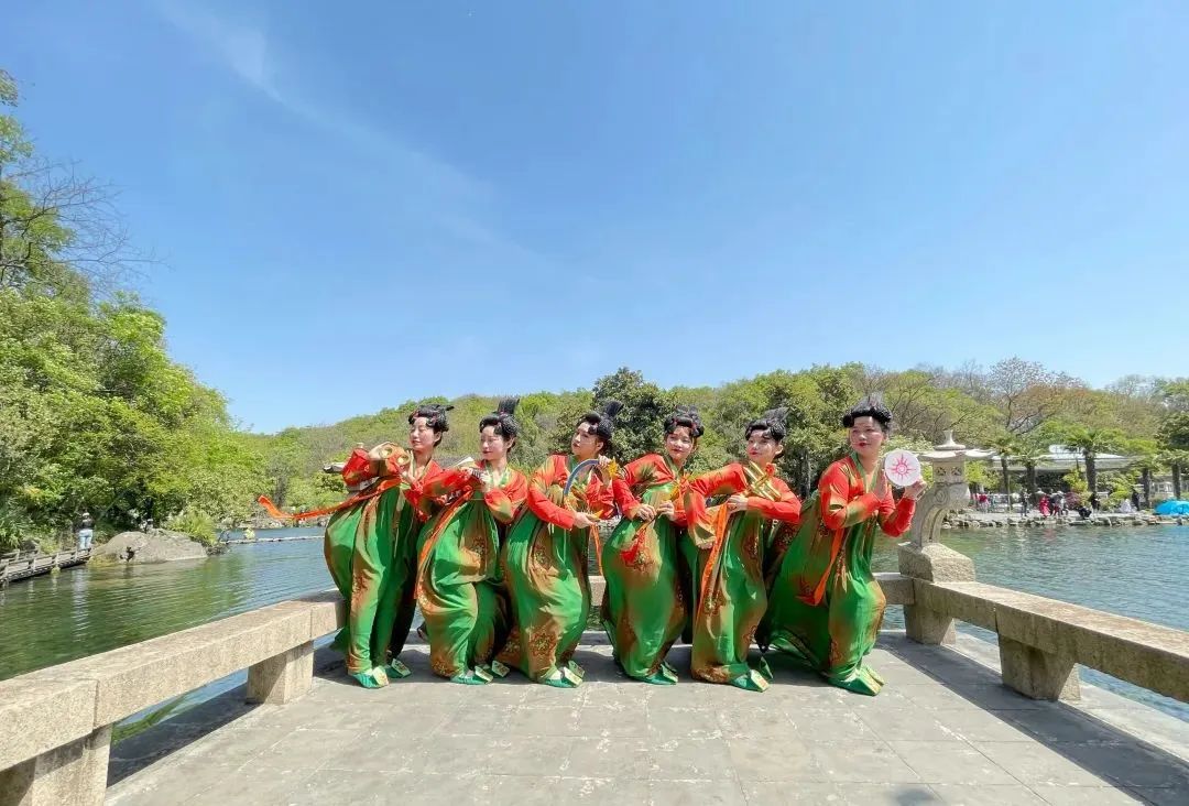 唐风不倒翁表演的小姐姐们身着精致明艳的唐装,身姿轻盈优雅起舞。