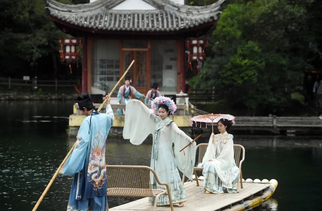晴雨泉水上舞台,游船穿梭,歌舞升平,让人徜徉山水之时,也能沉醉于古色古香的视听盛宴。