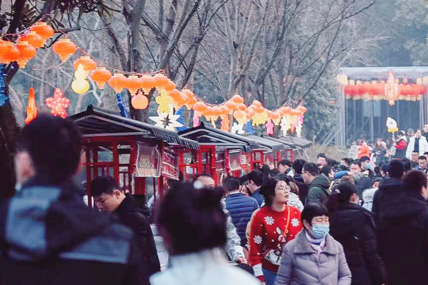 西大门入口、香樟林、镜山湖、“一泉三景”源头处、野营区广场......数十组“国潮花灯”同时点亮,华灯溢彩,年味扑面而来。