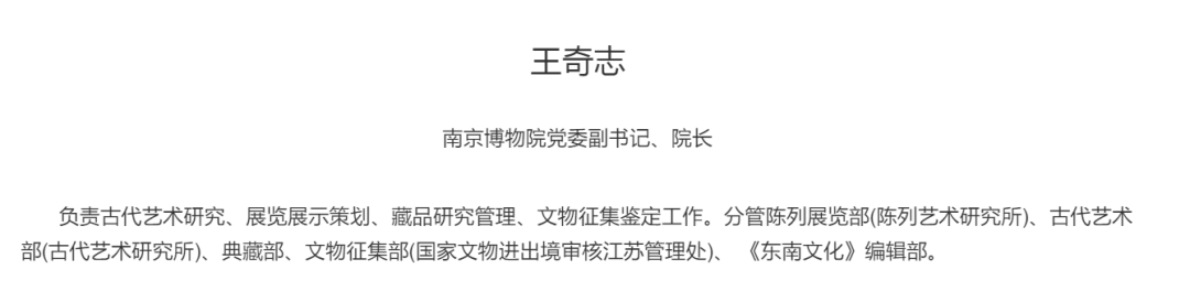 记者从南京博物院官网悉知,机构领导成员显示王奇志已任南京博物院党委副书记、院长。