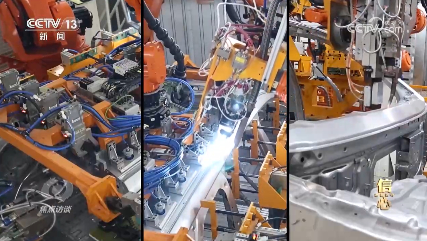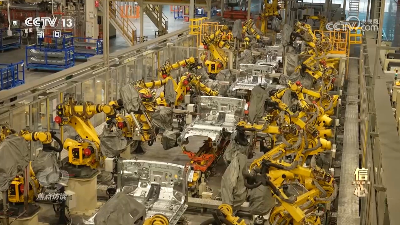 央视网消息(焦点访谈):制造业是立国之本、强国之基。中国制造正经历着从“制造大国”向“制造强国”的深刻转变。一家电梯制造智能工厂的生产线,十几台工业机器人同步在线运行,生产效率提升了50%。最新数据显示,中国每万名工人配备工业机器人470台,密度已经超过德国和日本,跃升到世界第三。我国新能源汽车生产首次突破年度1000万辆的仪式现场,2024年度达产1000万辆,仅用时11个月。中国新能源汽车产销量已经连续9年位居全球第一。中国经济有没有信心,关键看实体经济;实体经济有没有信心,关键看制造业。2024,我们不断发展新质生产力,培育壮大先进制造业集群,推动制造业高端化、智能化、绿色化发展,转型升级的步伐铿锵有力。