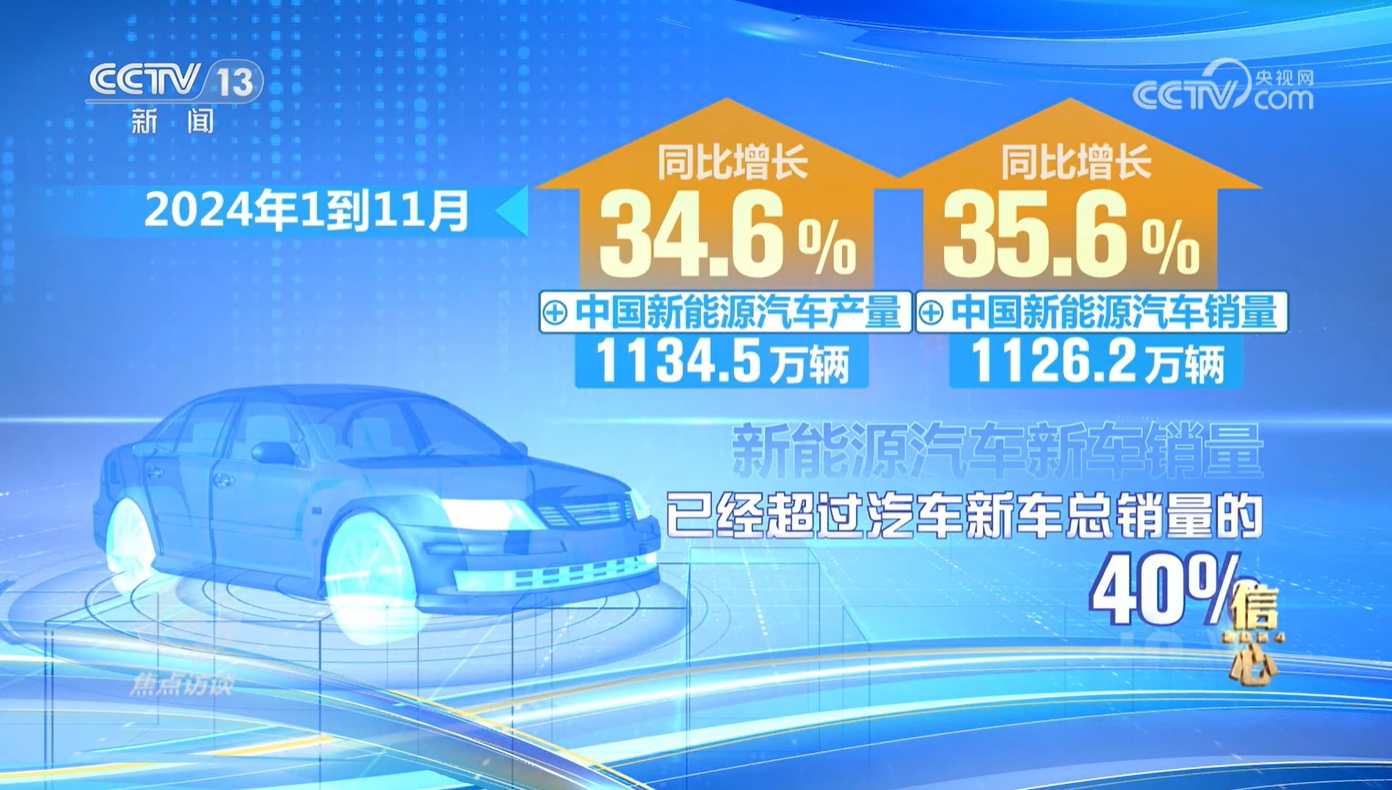 11月14日,中国汽车制造又迎来一个历史性的时刻。中国年度第1000万辆新能源汽车,在湖北武汉下线。统计显示,今年1—11月,中国新能源汽车产销分别完成1134.5万辆和1126.2万辆,同比分别增长34.6%和35.6%;新能源汽车新车销量已经超过汽车新车总销量的40%。