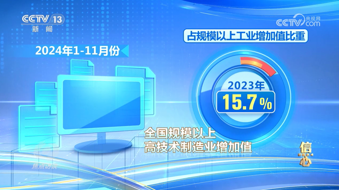 华工科技只是武汉光谷几千家高新技术企业中的一个。统计显示,我国高新技术企业数量从十多年前的4.9万家已经增加到现在的46.3万家。今年1—11月份,全国规模以上高技术制造业增加值同比增长9%,高于规模以上工业增速3.2个百分点。高技术制造业占规模以上工业增加值比重从2012年的9.4%提高到2023年的15.7%,显示出中国制造技术向高、结构向优的积极态势。