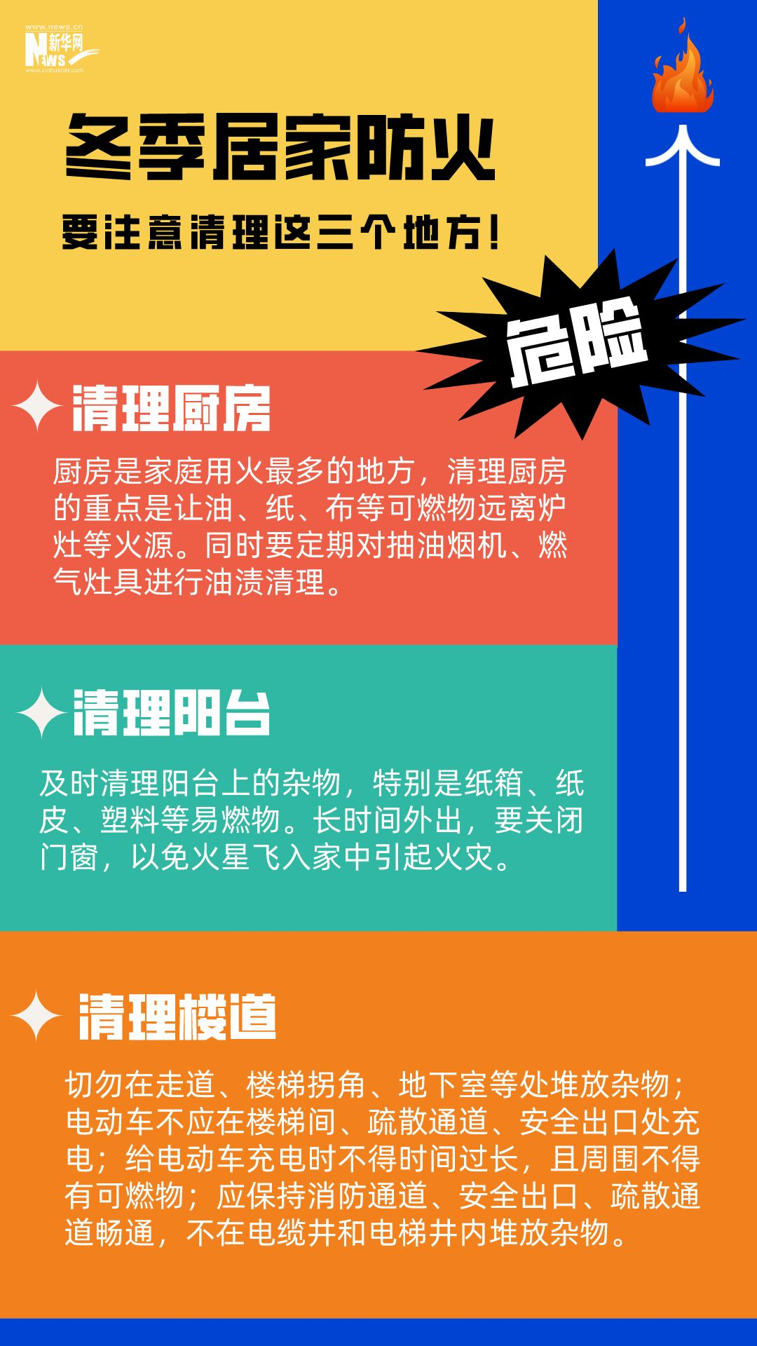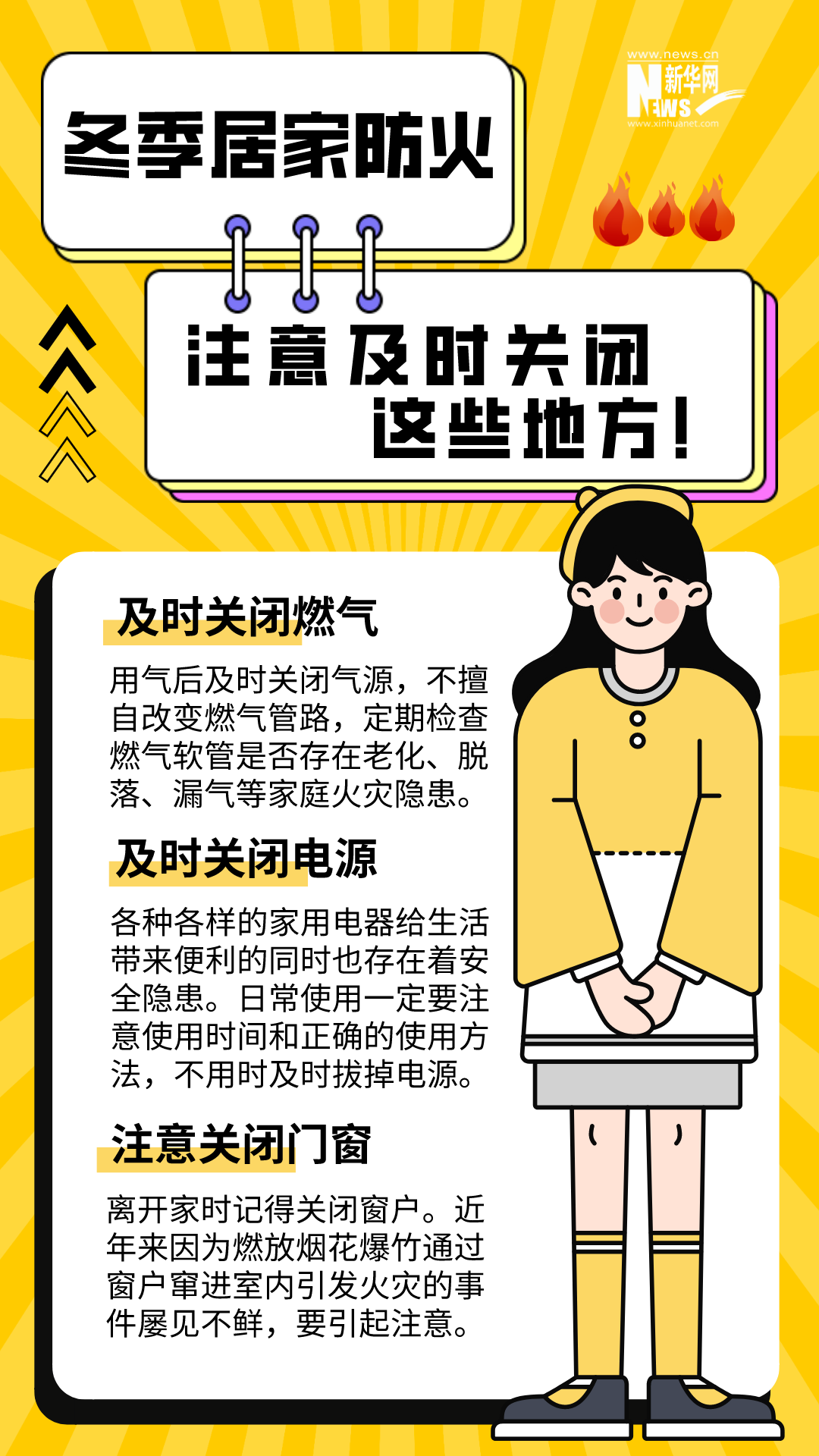 男子在家中用火盆取暖时,不慎引燃身上衣物;女子在电暖器上晾衣服引发火灾;母子二人因在家中烧煤取暖、通风不畅导致一氧化碳中毒......冬季天气寒冷干燥,昼夜温差大,生活用火、用气、用电增加。若疏忽大意,极易引发火灾。安全过冬,居家防火这些细节要注意。