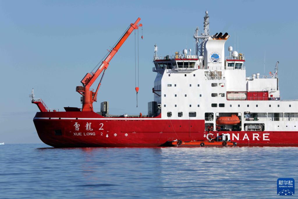 2024年12月27日,执行中国第41次南极考察任务的“雪龙2”号极地科考破冰船在南极秦岭站海域卸货。新华社记者 黄韬铭 摄