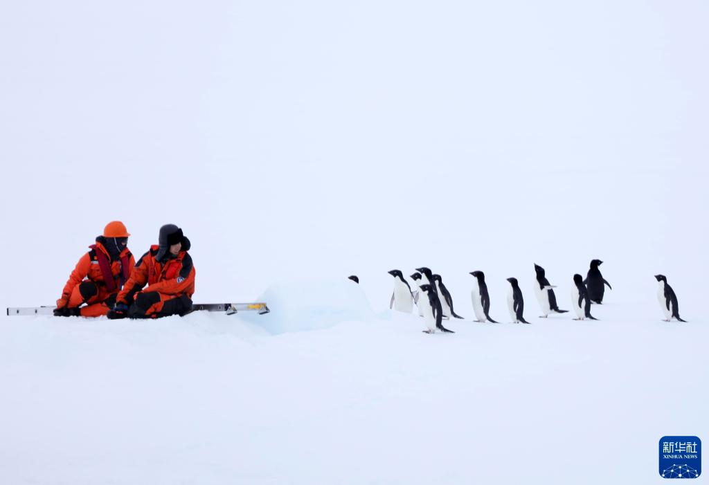 2024年12月8日,第41次南极考察队员吸引了企鹅前来“围观”。 新华社记者 黄韬铭 摄