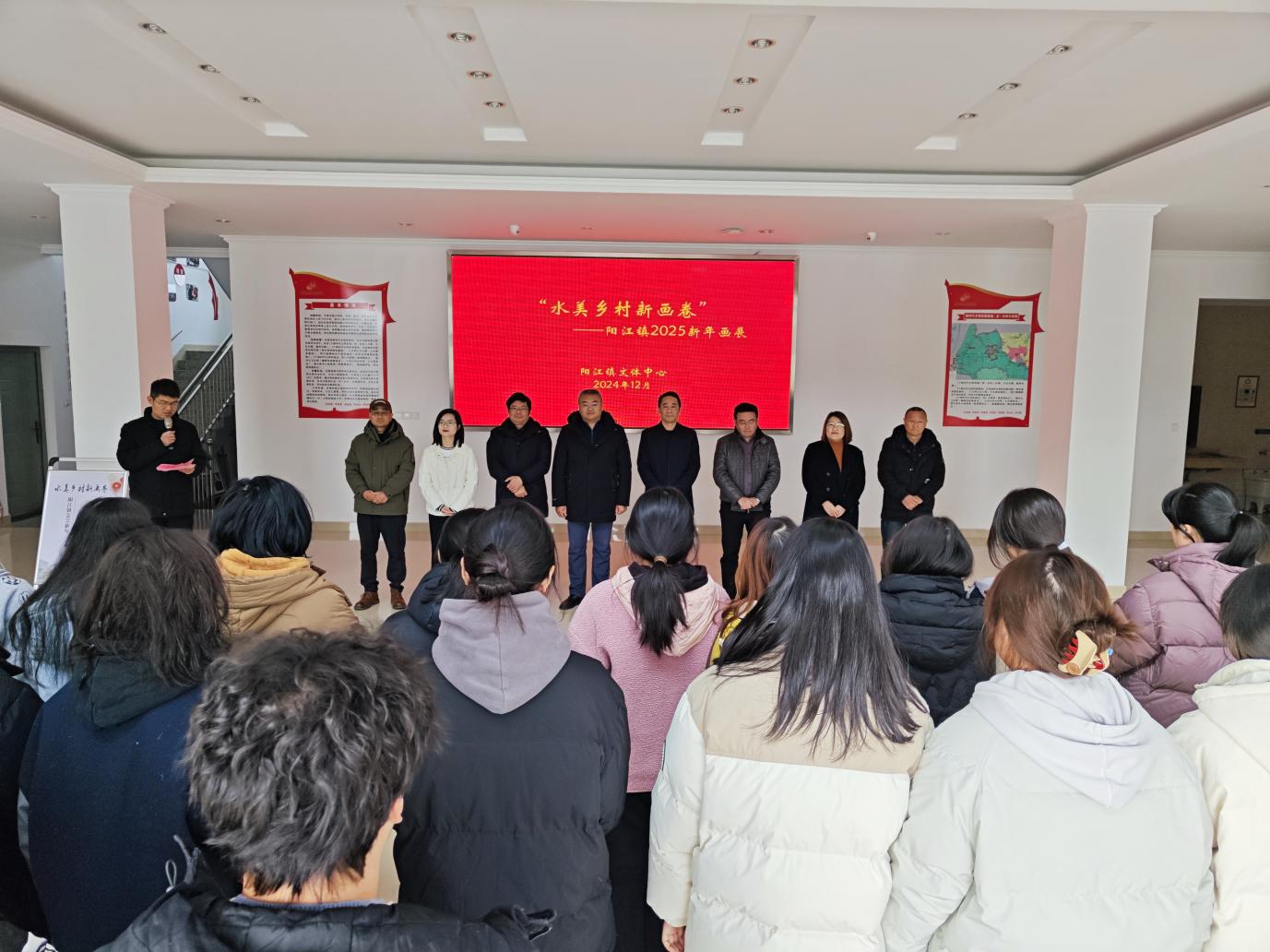 12月27日,由阳江镇、南京机电职业技术学院联合举办的“水美乡村新画卷”新年画展开幕式在阳江镇文体中心一楼大厅举行。高淳区文旅局副局长史新华、区文联三级调研员卞洪广、区美术家协会主席李剑鸣、南京机电职业技术学院副院长刁爱军、阳江镇人大主席吕新海、阳江镇宣传统战委员史凤华等出席开幕式,开幕式由阳江镇副镇长朱斌斌主持。