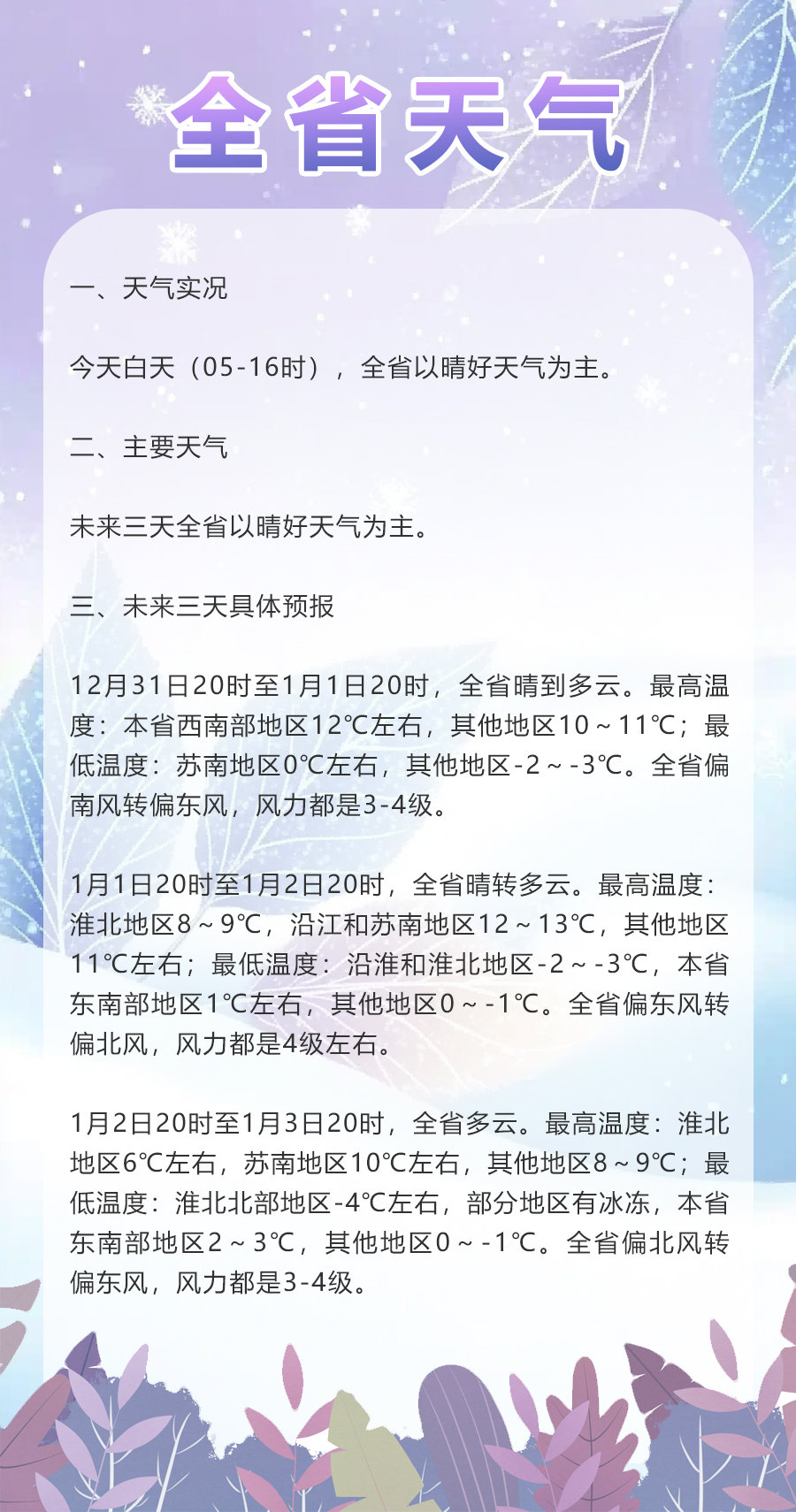 1月1日20时至1月2日20时,全省晴转多云。最高温度:淮北地区8~9℃,沿江和苏南地区12~13℃,其他地区11℃左右;最低温度:沿淮和淮北地区-2~-3℃,江苏东南部地区1℃左右,其他地区0~-1℃。全省偏东风转偏北风,风力都是4级左右。