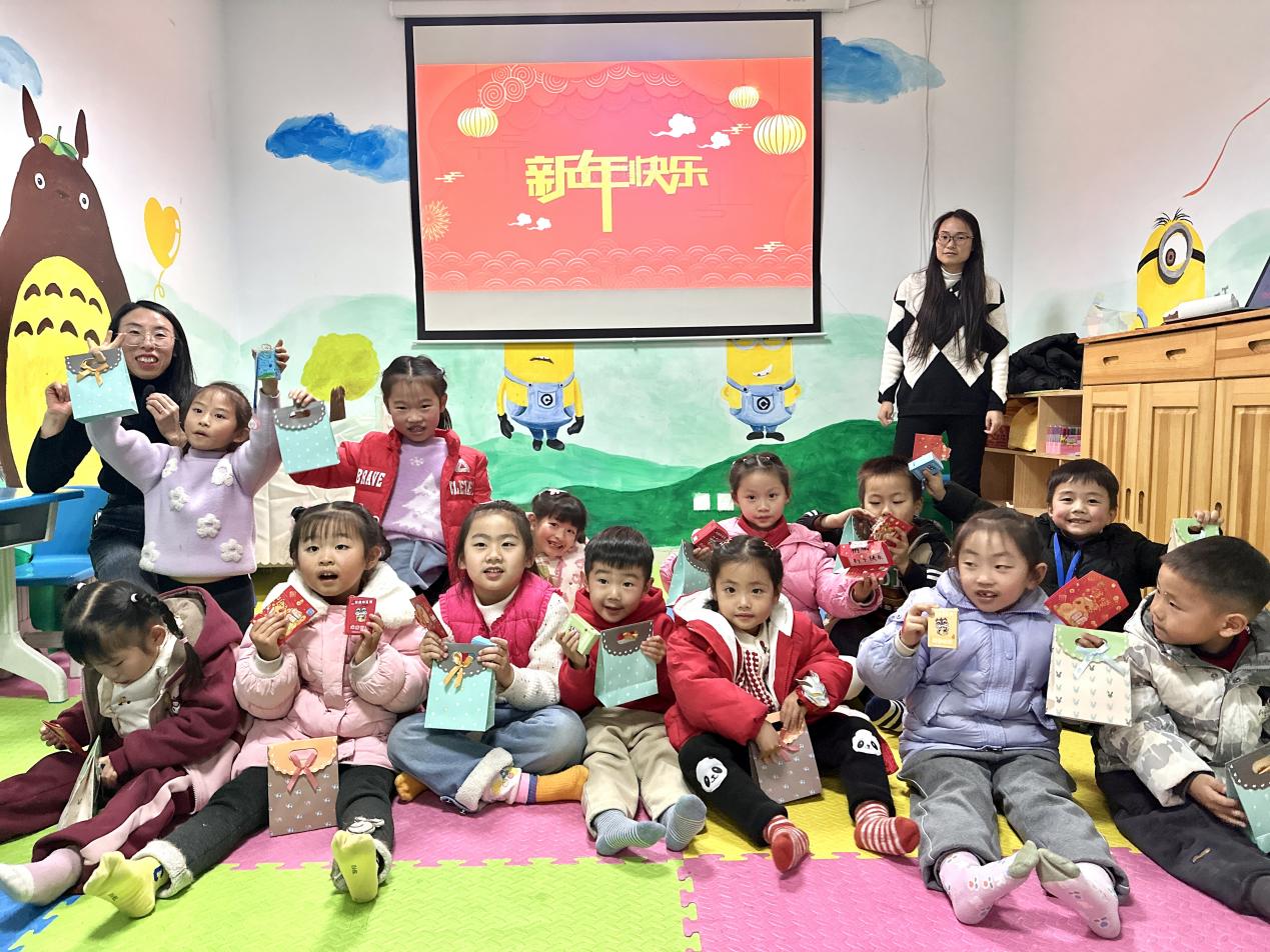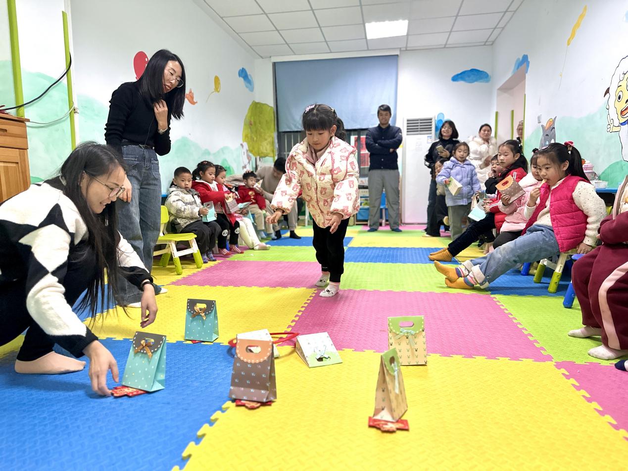 课堂分享后,老师和青年志愿者还准备了套圈互动游戏,孩子们挨个套圈,套完后完成相应的指令,比如向家长说一句新年祝福、讲述自己过年的经历、寻找小伙伴去“送年货”等等。现场充满了乐趣和挑战,大家争相尝试,气氛热烈而欢乐。