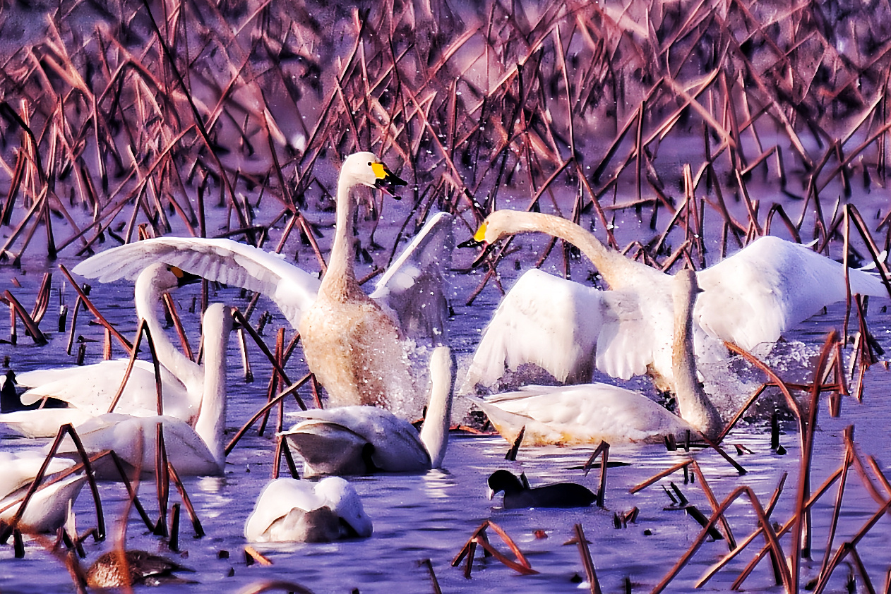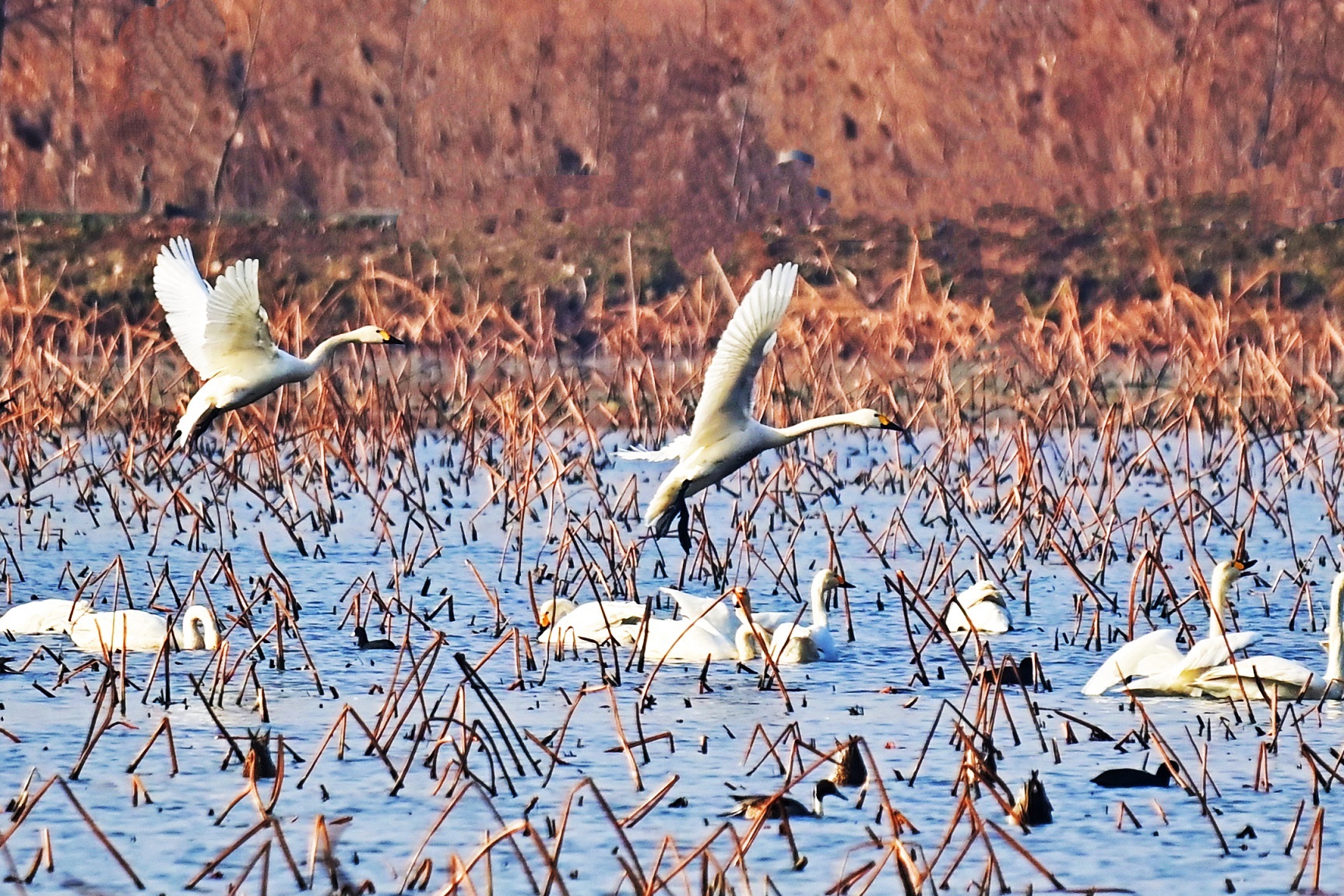 近日,在江苏省盐城市建湖县颜单镇楼港村马鹿垛荡区,成群的越冬天鹅,或岸边觅食,或水中嬉戏,或空中飞翔,十分悠闲舒适,为冬日的湖荡增添了一份灵动和生机,吸引周边群众和爱鸟人士前来打卡拍照。