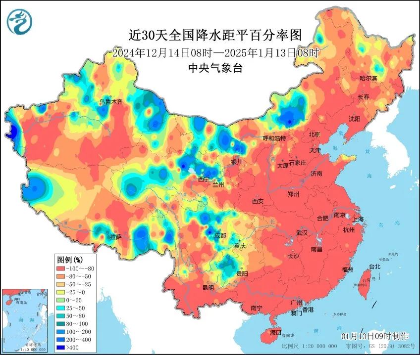 从降水距平图上可以看出,近30天全国大部地区降水较常年同期偏少,此外南方气象干旱成片发展,广西、广东、湖南、江西等地部分地区出现特旱。