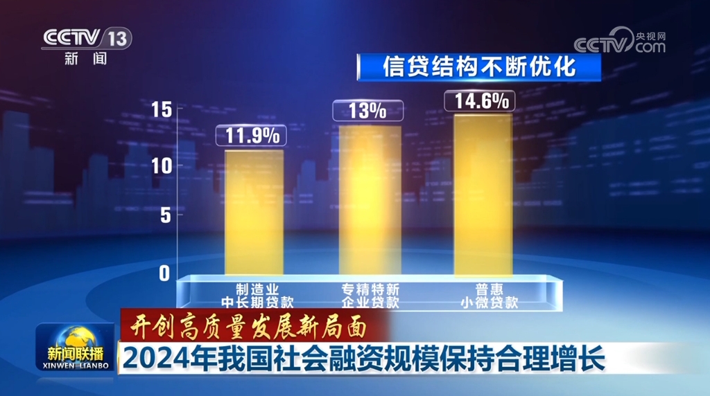 中国人民银行相关负责人介绍,2024年12月末,社会融资规模存量为408.34万亿元,其中,对实体经济发放的人民币贷款余额为252.53万亿元,同比增长7.2%。信贷结构不断优化,制造业中长期贷款、专精特新企业贷款、普惠小微贷款增长较快,继续高于同期全部贷款增速。