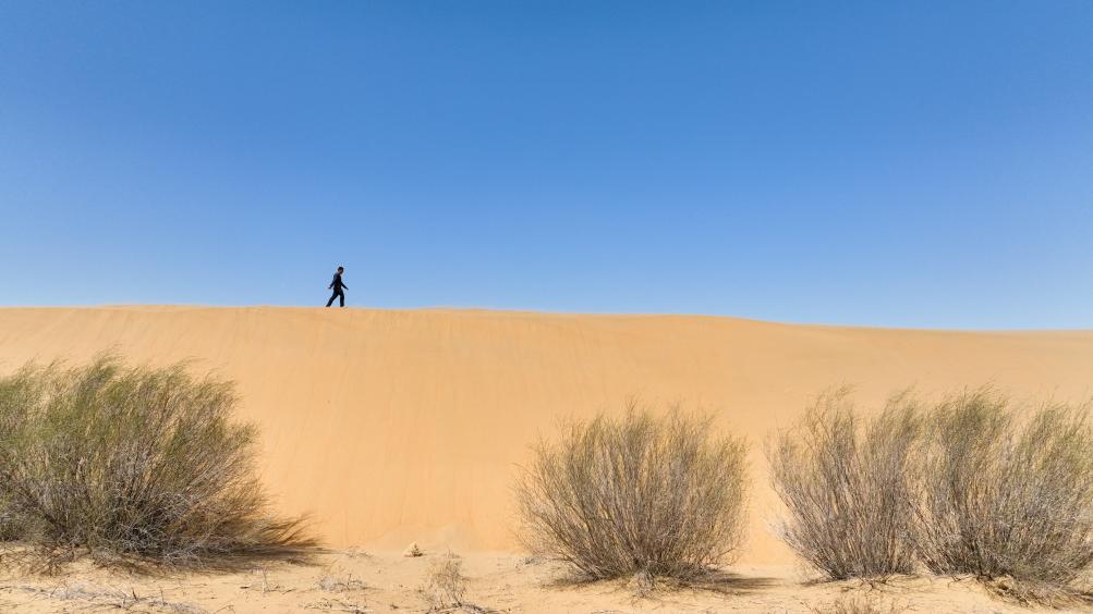 2024年4月11日,一名治沙人行走在达拉特旗境内的库布其沙漠里(无人机照片)。新华社记者 贝赫 摄