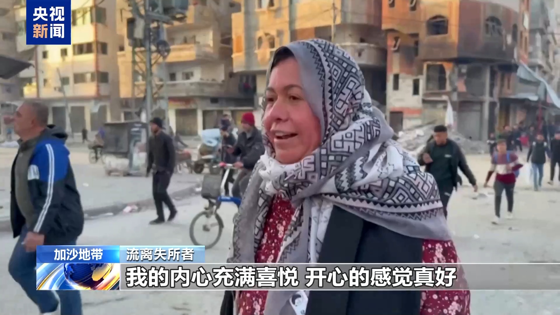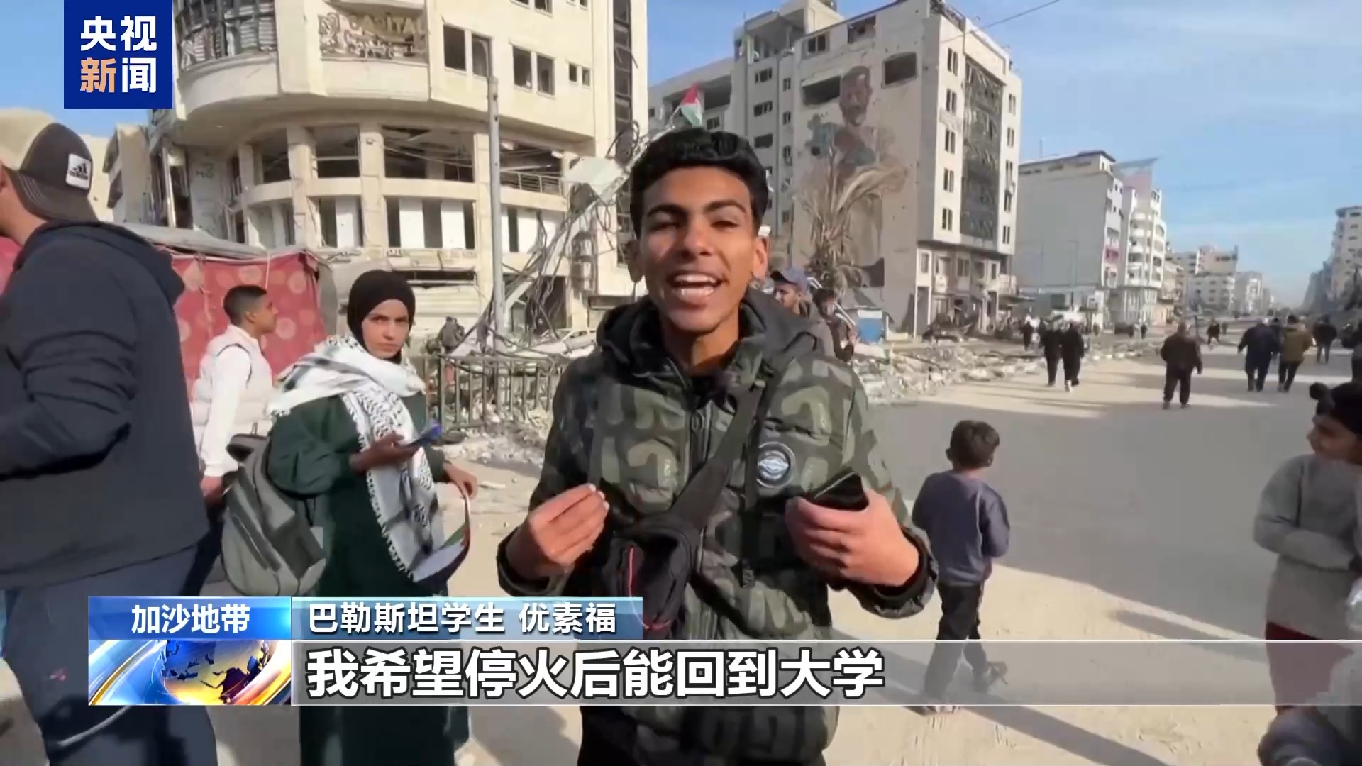 巴勒斯坦学生 优素福:我想上学,但是所有大学都被炸毁了。我希望停火后能回到大学,让我的未来和梦想成为现实。在这个日子,我非常非常开心,我们不会忘记加沙历史上的这一天,这一天是2025年1月19日。