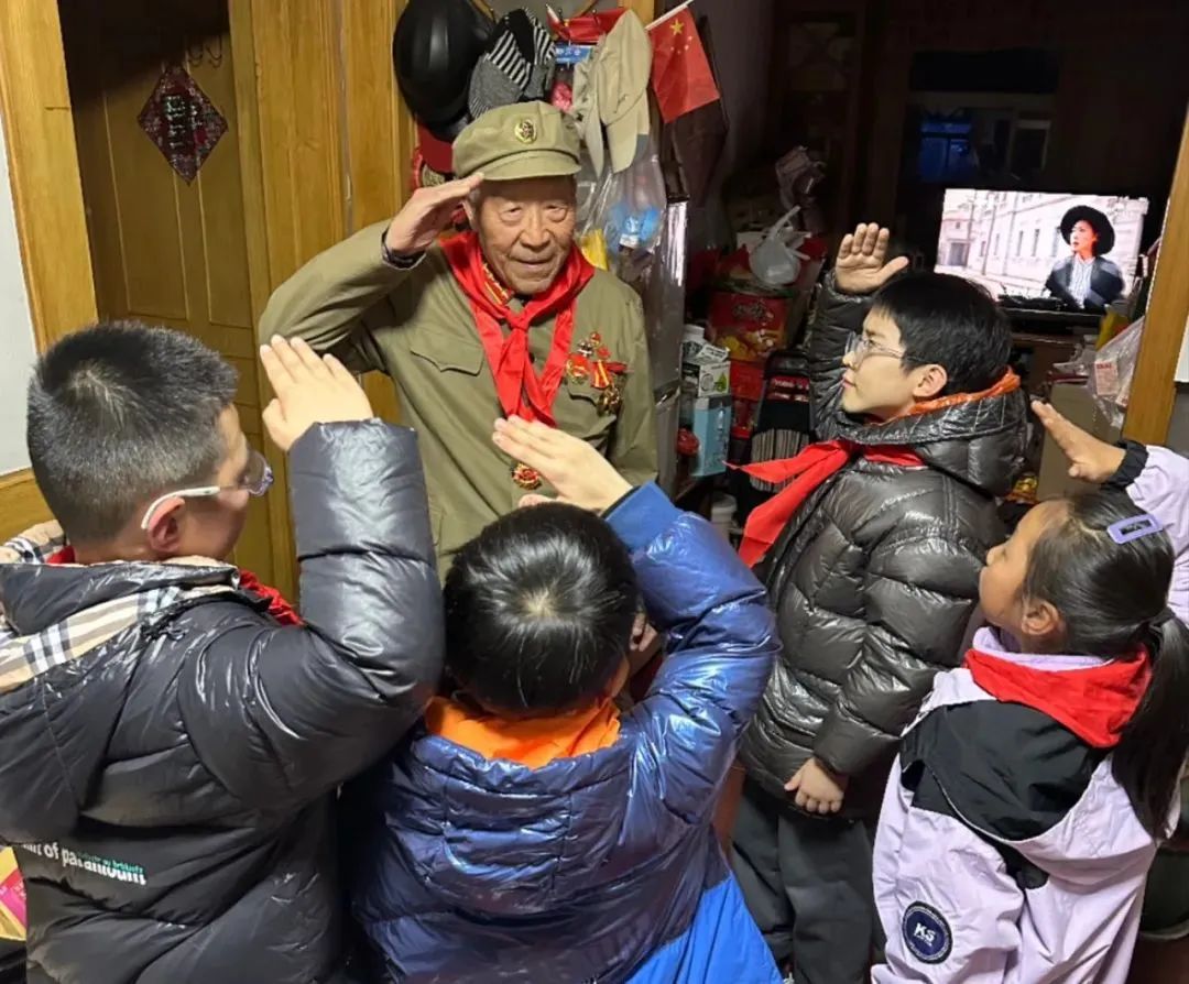老人讲述自己用生命守护祖国的过往,孩子们也给老爷爷唱歌、敬礼,送去少先队员最崇高的敬意,老人再次向孩子们表示了感谢。孩子们也表示要向爷爷学习,不怕苦不怕累,努力学好知识,练强自身本领,长大报效祖国。