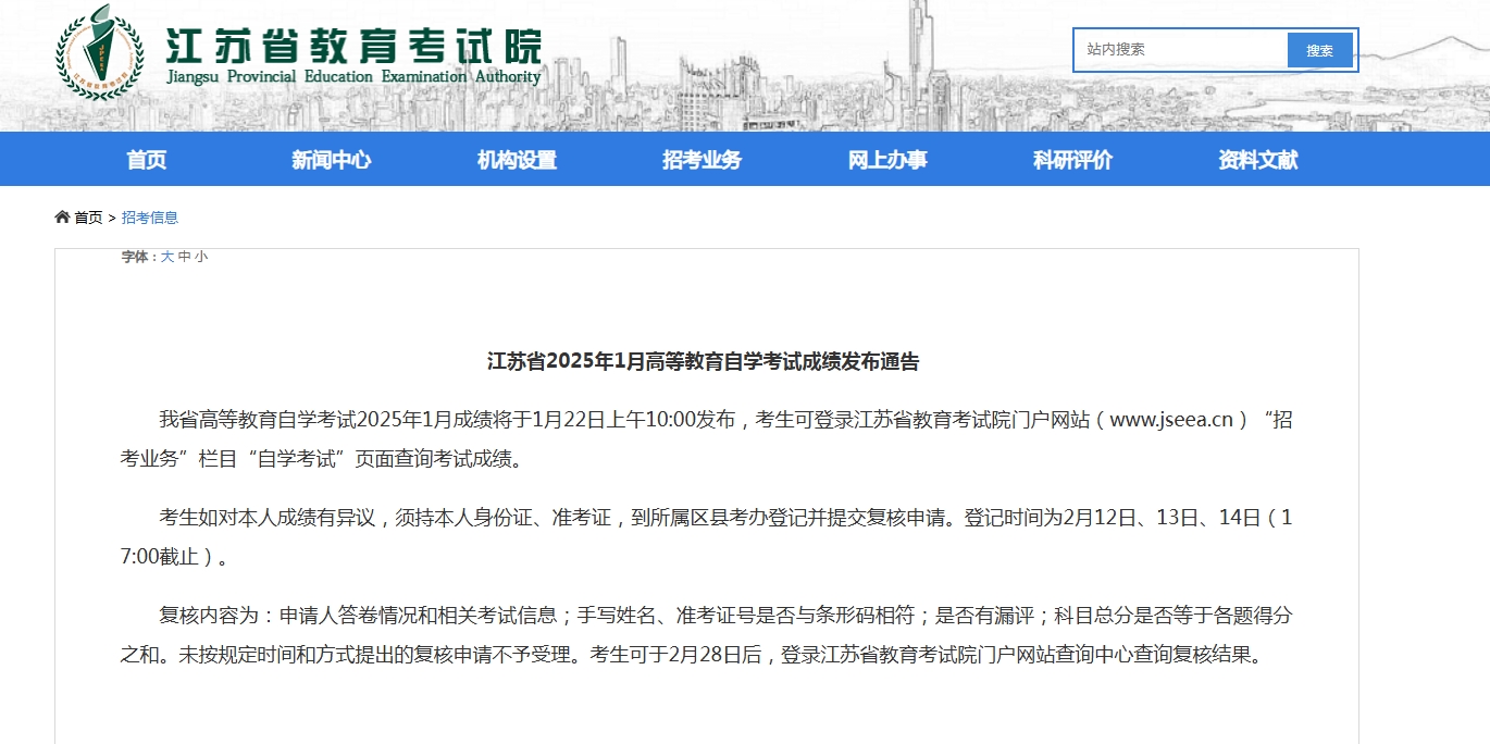注意啦!江苏省高等教育自学考试2025年1月成绩,已于今天(1月22日)上午10:00发布。考生可登录江苏省教育考试院门户网站(www.jseea.cn),“招考业务”栏目“自学考试”页面,查询考试成绩哦。