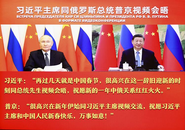 1月21日,中国国家主席习近平在北京同俄罗斯总统普京举行视频会晤,两国元首互致新年祝福。习近平强调,新的一年,我愿同总统先生一道,继续引领中俄关系登高望远,以中俄关系的稳定性和坚韧性应对外部环境的不确定性,共同促进两国发展振兴,维护国际公平正义。