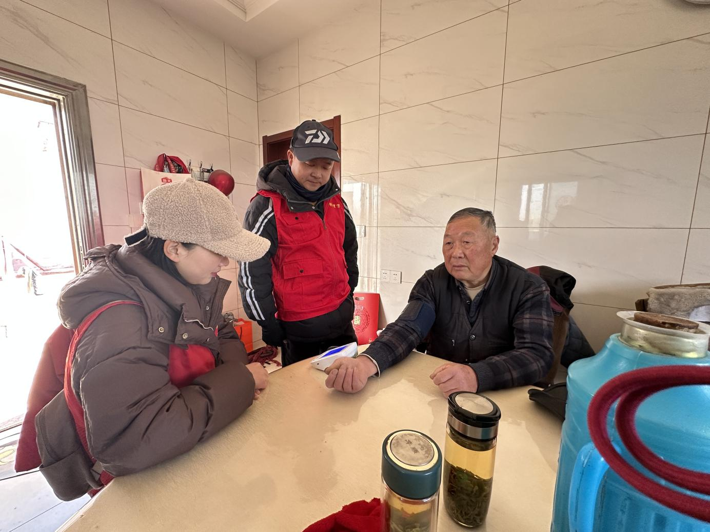 “张奶奶,您这个血压还是有点高,一定要按时吃药,芹菜、菠菜、茼蒿菜这些都是有助于降低血压的蔬菜,可以适量吃一些。”志愿者一边帮村民测量血压,一边贴心提醒。量完血压,志愿者还向村民们讲解了常见的相克食物以及日常保健知识。