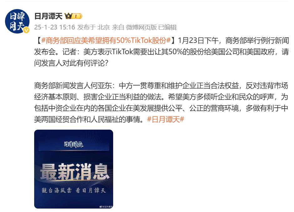 1月23日下午,商务部举行例行新闻发布会。记者:美方表示TikTok需要出让其50%的股份给美国公司和美国政府,请问发言人对此有何评论?