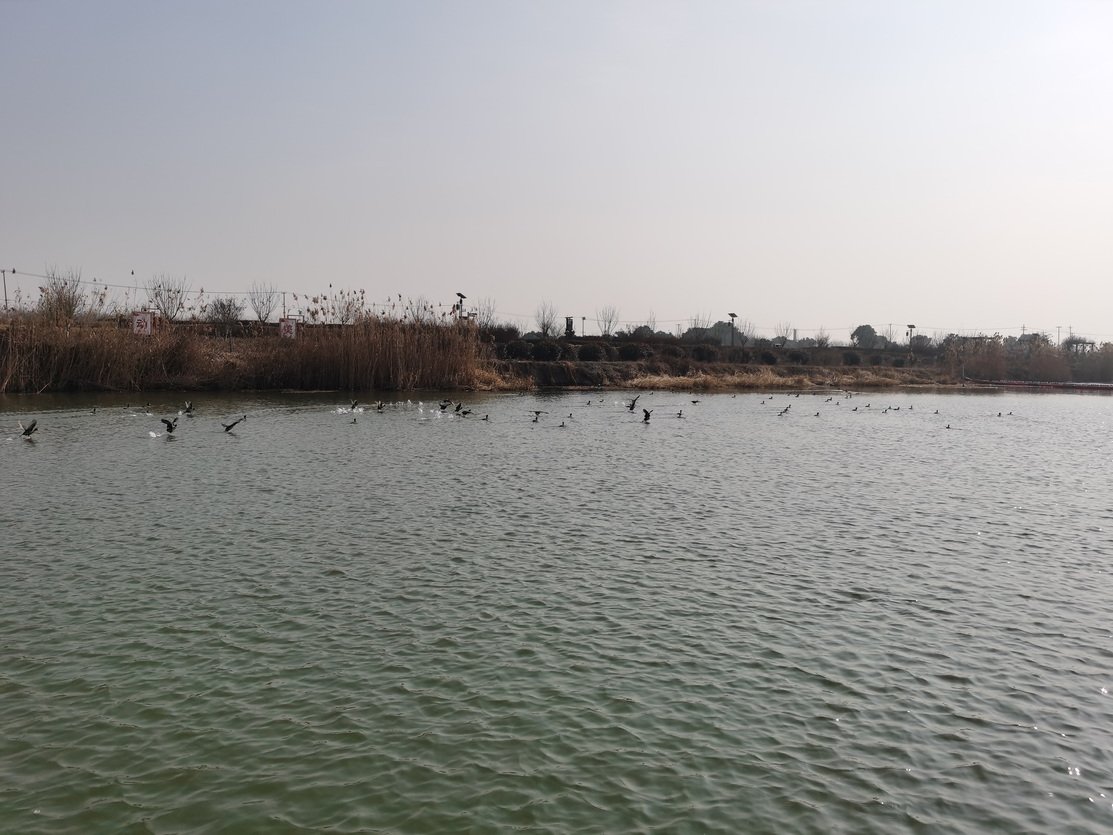 进南门、登游船,景区工作人员房文国麻利地解开拴绳。由南向北,游船向湖中央驶去。湖面上,黑乎乎的獐鸡三五成群,时而展翅飞跃,溅起朵朵水花。