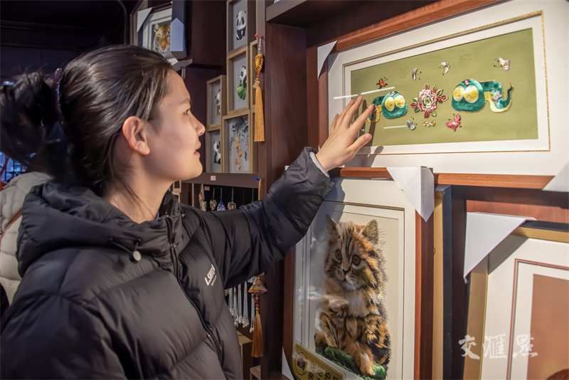 1月22日,江苏省文艺志愿“迎新春”集市活动在南京宝船公园广场举行,金陵刻经、剪纸、木版年画等特色非遗及文创产品展示,吸引市民前来参观。李慎凯摄 视觉江苏网供图