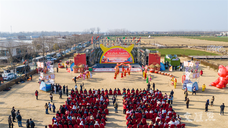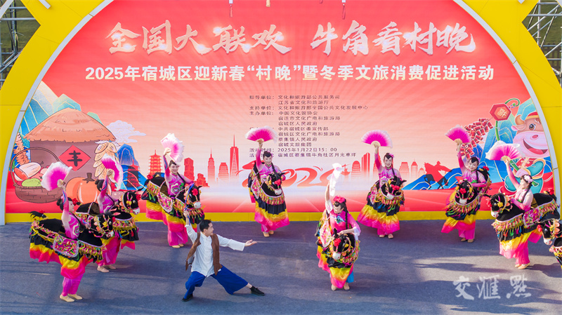 1月22日,“全国大联欢 牛角看村晚”2025年宿城区迎新春“村晚”暨冬季文旅消费促进活动在宿迁市宿城区蔡集镇牛角社区月光草坪举行,苏北大鼓、跑驴、舞龙等精彩节目依次亮相,营造喜庆氛围,迎接新春佳节。徐瑞摄 视觉江苏网供图