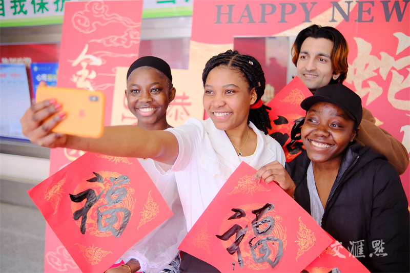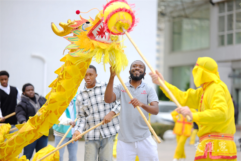 1月22日,南通职业大学开展留学生迎新春系列联欢活动,留学生学舞龙、写“福”字、表演歌舞,感受浓浓的中国年味。徐培钦摄 视觉江苏网供图