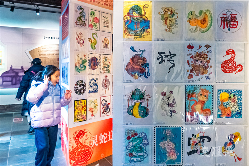 1月19日,市民和游客在苏州生肖邮票博物馆参观“全国第二十届生肖(乙巳年)个性化邮票青少年创意设计大赛优秀作品展”,感受浓浓年味。张锋摄 视觉江苏网供图