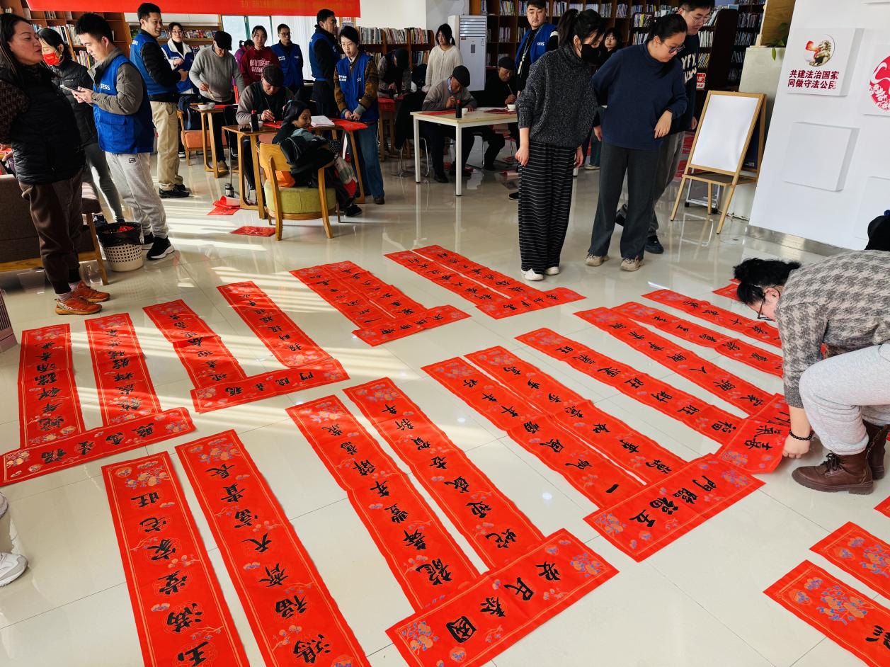 与此同时,青年志愿者们与三星半导体社会公益团的成员们也忙碌在活动现场。他们协助书法爱好者们摆放纸张、研磨墨水,引导居民有序地挑选春联。在他们的热情服务下,整个活动秩序井然,气氛热烈。