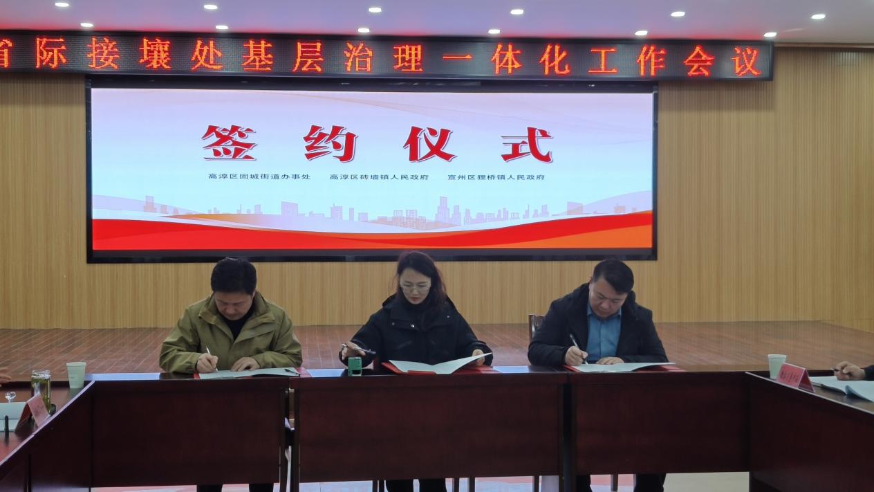 会上,狸桥镇、固城街道及砖墙镇的领导分别就推进省际接壤处基层治理一体化工作进行了发言,相关村也交流了联防联调工作的经验,提出有益的建议和意见。各方还签订了省际接壤处基层治理一体化合作协议。
