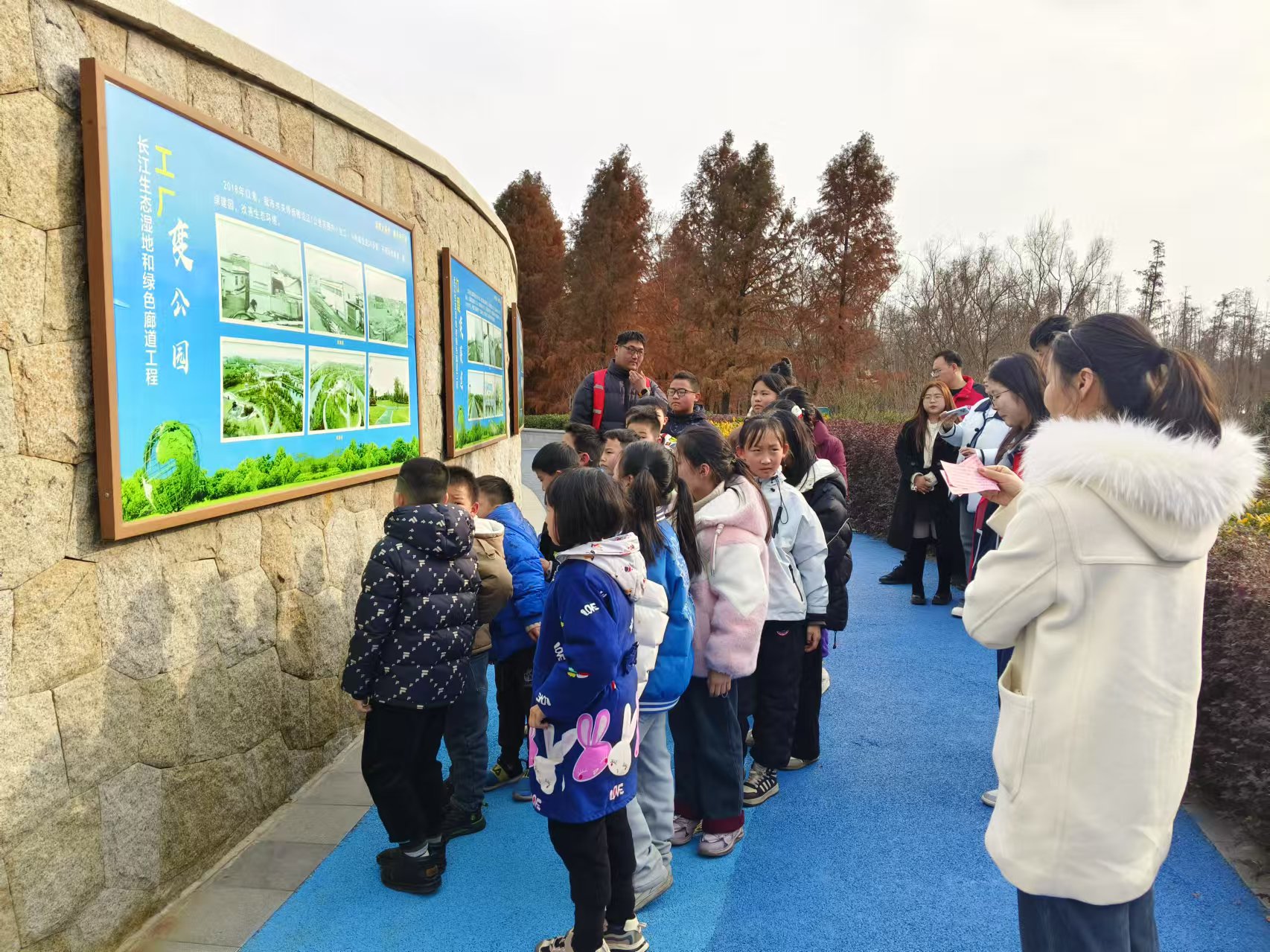 支薇引导孩子们来到对比图前,“大家看,原来江边滩涂上排满了100个大大小小的鱼塘,还有6家小船厂和很多化工厂,对长江造成很大的污染。后来,我们市里下决心将这些‘污染分子’都搬迁拆除,现在,船厂变森林、鱼塘变湿地、江堤变赛道、工厂变公园,‘日出江花红胜火,春来江水绿如蓝’的大江风光重新出现在我们眼前。”听完支薇的介绍,小朋友们纷纷拍手叫好。