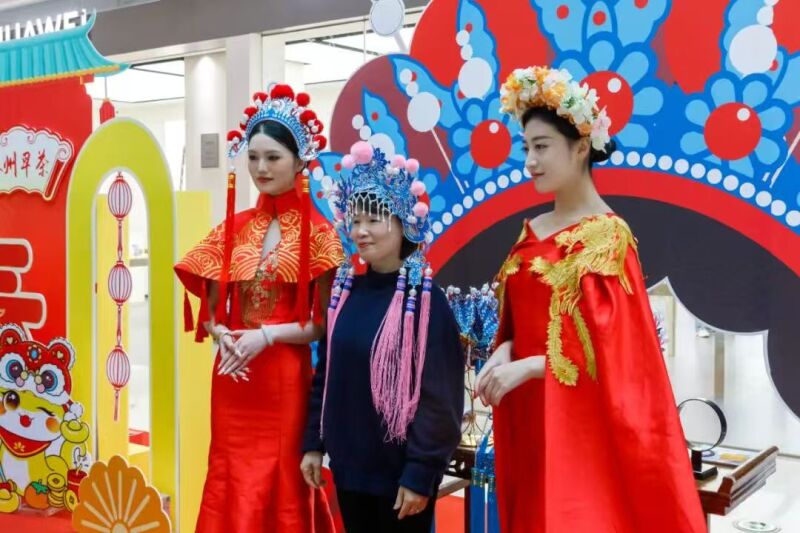 在“春映民俗”打卡区,本次活动特别邀请“新时代江苏好少年”郑舒心上台演唱《贵妃醉酒》等经典曲目,现场还特地准备了簪花和凤冠头饰,向群众展示中国传统民俗文化,供市民佩戴、拍照留念。“早茶印象”摊位用丰富的文创产品展现泰州的早茶文化,引来不少市民驻足咨询。“绿蕴瑞春”摊位则摆放着各种样式的“扬派”盆景,供群众拍照打卡。
