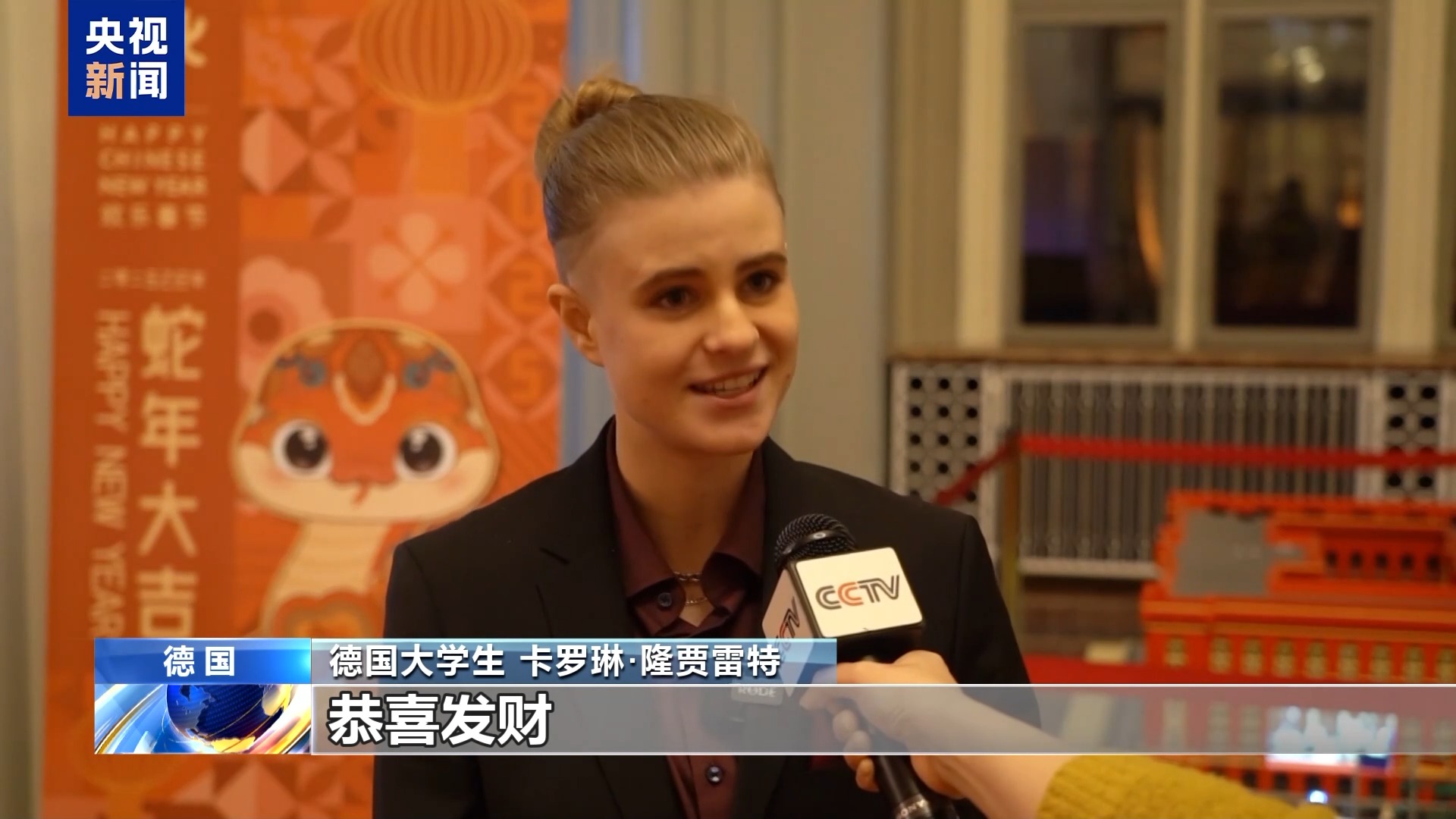 德国大学生 卡罗琳·隆贾雷特:我祝我的中国朋友春节快乐,我祝大家恭喜发财。