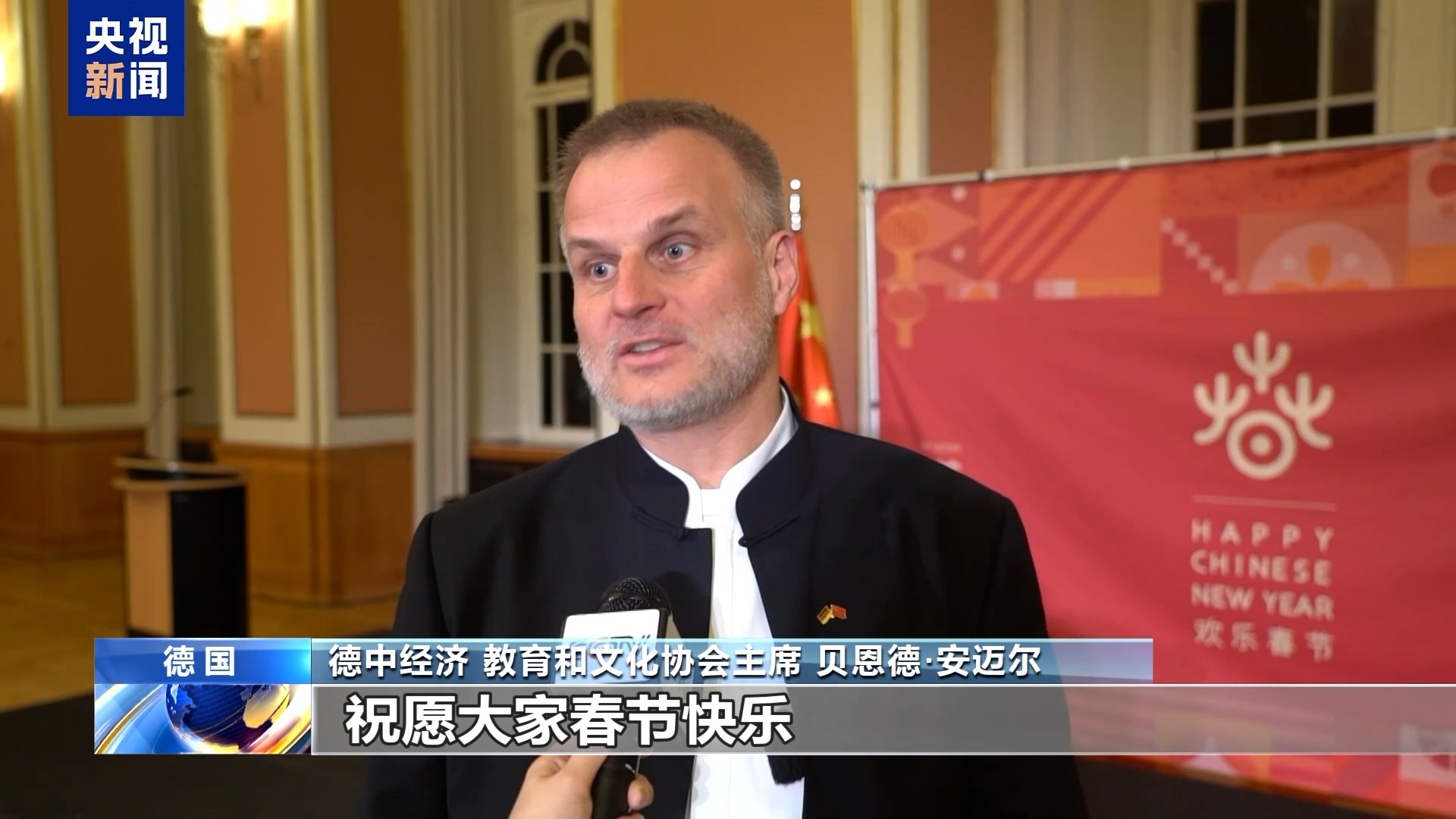 德中经济、教育和文化协会主席 贝恩德·安迈尔:我认为联合国教科文组织将春节列入非遗名录意义重大,因为春节是一个全球性的节日。祝愿大家春节快乐。