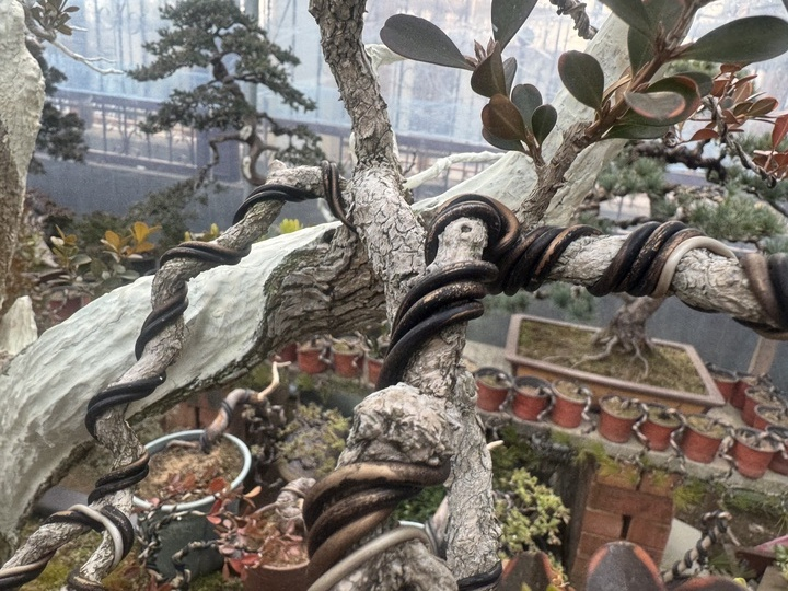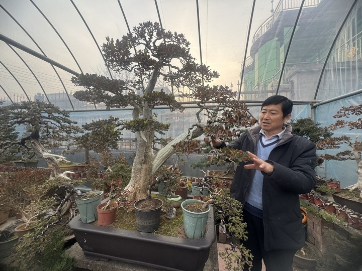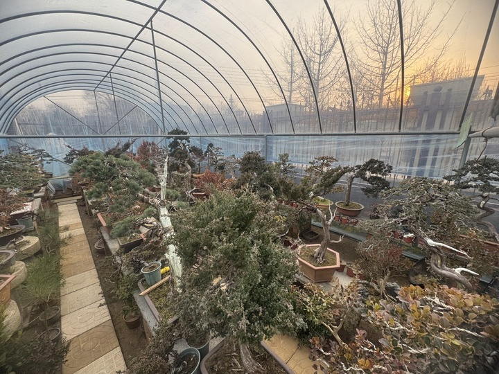 “几天能做好的这类‘小品’进货价一般都是5元左右,成交价平均能达500元左右,好一些的作品几千元,需要‘养’上几年甚至几十年的‘镇店之宝’,各家多少也都存了几个,平时作为店铺里的展品,替我们招揽人气。”到家后,姜野走到院里旁的一个只有几十平米的温室大棚,里面摆满了各式各样的盆景,今年62岁的姜柏正拿着剪刀和铝条,在给一株半人高的地柏做护理。