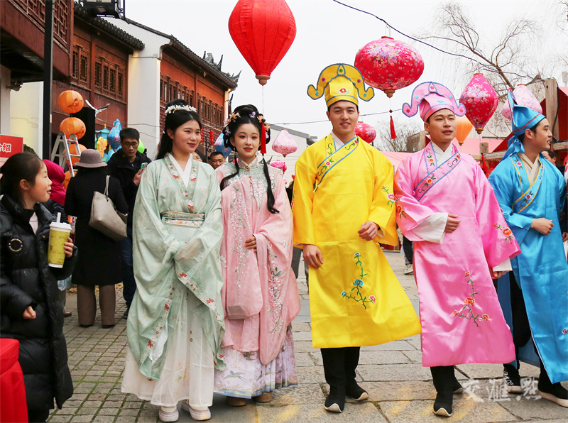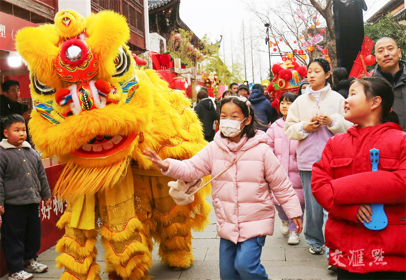 1月25日,苏州桃花坞唐寅故居文化区举办舞狮、皮影戏表演、灯彩展示等迎新春活动,吸引市民和游客前来参观体验,感受喜庆节日氛围。阙明芬摄 视觉江苏网供图