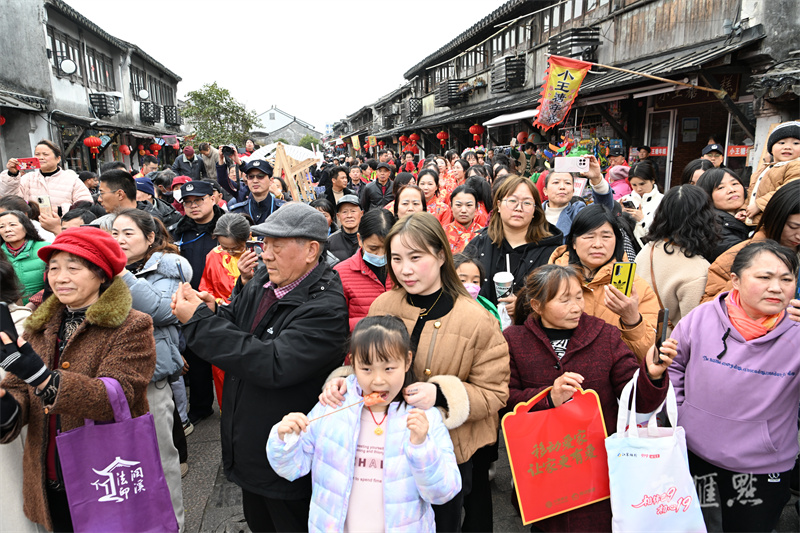 1月24日,太仓市沙溪镇进行舞龙、腰鼓等民俗展演,营造节日氛围,吸引市民和游客观看。计海新摄 视觉江苏网供图