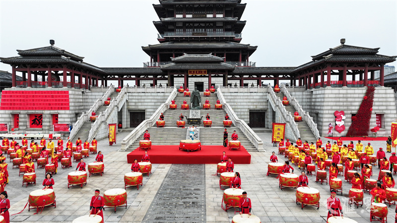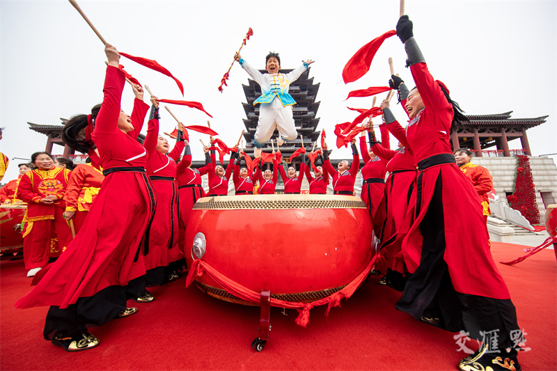 1月25日,泗洪县组织150名鼓手在古徐城景区表演,百鼓齐鸣,让人们感受浓浓年味。 许昌亮 李佳摄 视觉江苏网供图