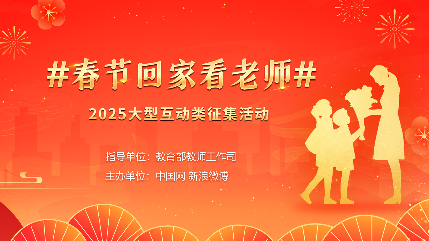 2025年,由教育部教师工作司指导,中国网、新浪微博联合发起的第二届#春节回家看老师#大型互动类征集活动上线,春节期间,您与老师重聚的温情画面、促膝长谈的幸福掠影,都是我们期待的好作品,都是点亮这个新春佳节的暖心之举。