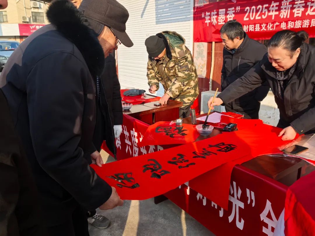 执笔贺春墨香送福。赶集现场,书法老师们红幅铺展、饱蘸浓墨,奋笔疾书、笔锋婉转、浓墨飘香,春联与“福”字气韵生动、寓意喜庆吉祥,满载着美好祝愿,让整个现场洋溢着浓浓的欢乐和喜悦。短短的时间,几位书法老师就书写出近百副深受群众喜爱的新春对联和“福”字,群众们拿着这些春联,都非常高兴,纷纷表示谢意与赞美:“虽然现在春联随处可以买到,但书法老师现场写的春联,与买春联的感觉完全不同,这样年味更浓,更有意义。”