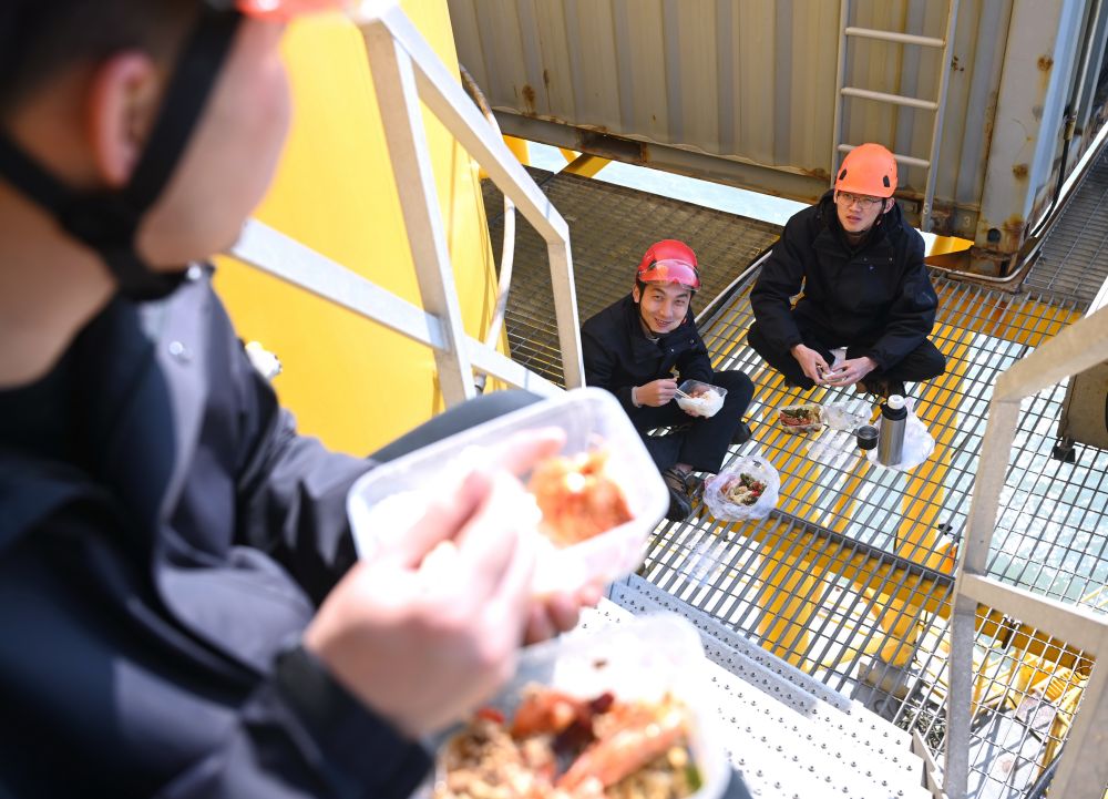 工程师们在海上风电塔基上吃着从岸上带来的午餐。新华社记者 林善传 摄